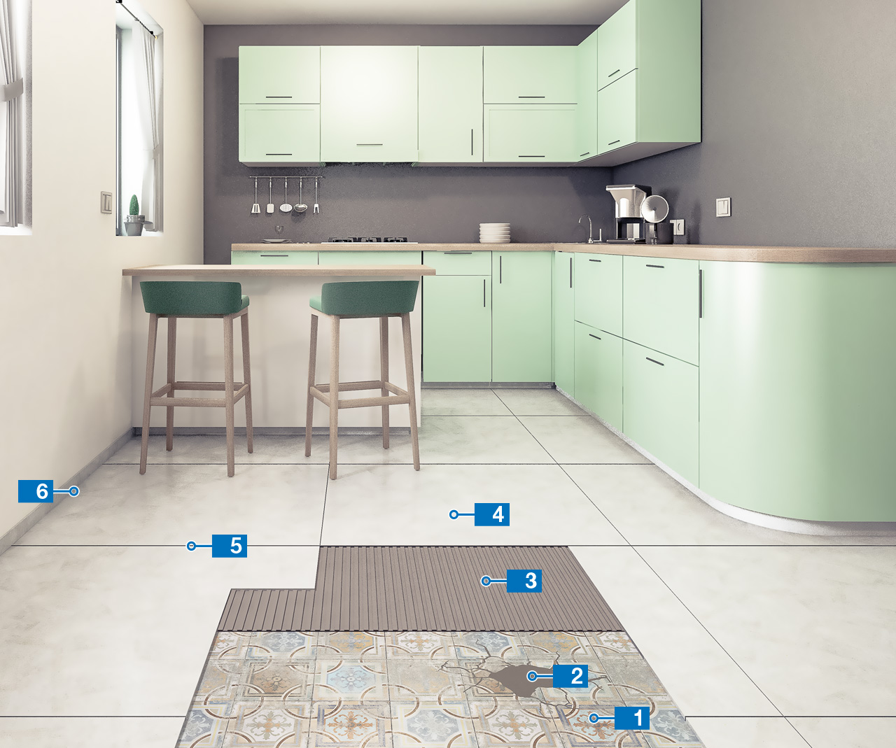 System for installing ceramic tiles over existing ceramic floor tiles