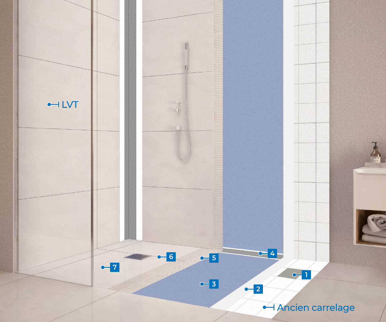 Comment réaliser une douche complète en LVT sur un ancien carrelage ?